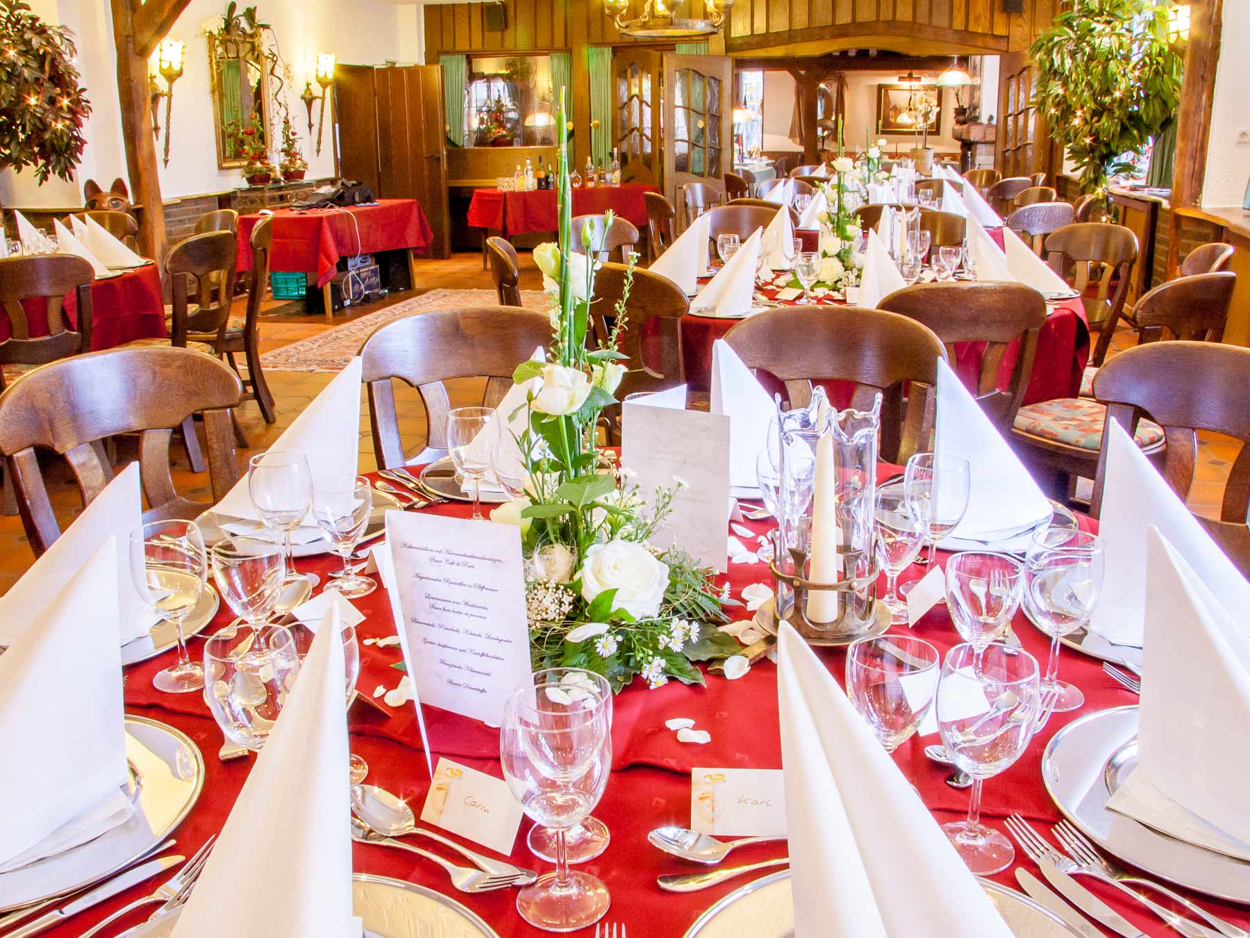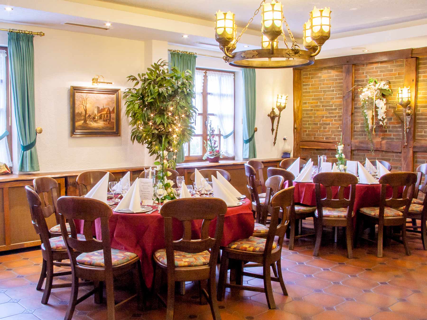 Der Festsaal ist ein stilvoller Rahmen für Festivitäten aller Art und bietet Platz für mehr als 70 Personen. „Ihr” Fest gestalten wir liebevoll und zuverlässig nach Ihren Wünschen.